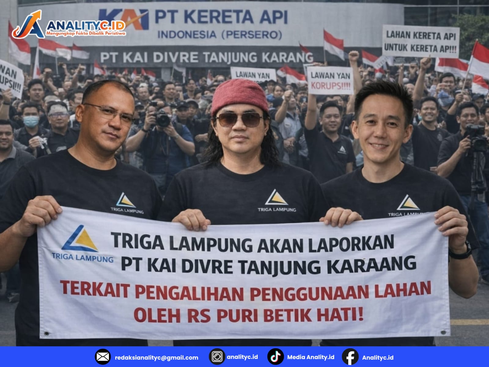 Bandar Lampung, Analityc.id – Aliansi Triga Lampung menyatakan akan melaporkan pihak PT Kereta Api Indonesia (Persero) Divisi Regional IV Tanjungkarang ke kantor pusat PT KAI di Bandung serta Kementerian Perhubungan Republik Indonesia. Langkah ini diambil terkait dugaan penyalahgunaan lahan aset perkeretaapian oleh RS Puri Betik Hati di wilayah kecamatan Way Halim, Bandar Lampung (8/4/2026).